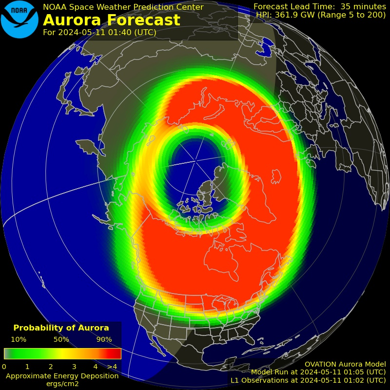 NOAA Aurora Forecast channel is a perfect visualization of probability of an aurora and its intensity. Usually, the calculated Aurora Oval is having mostly greenish colours, but occasionally, its middle part turns yellow or red. That change in colour is quite important for higher mid-latitudes and indicates good chances of seeing a visual aurorae (even if the Oval is not quite reaching your latitude).