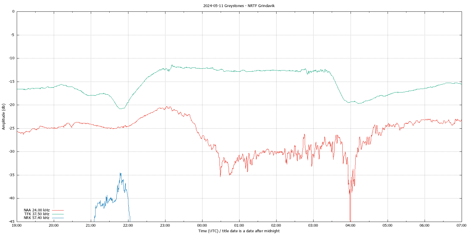 Ionospheric VLF plotter is our very own, experimental feature. We have a detailed guide of how to read the graphs in the User Articles section. The plotter is based on continuous measurement of the lower ionosphere's state. During potential aurorae both green and blue plotter graphs starts to deflect heavily within a short period of time, usually minutes. For a chance of higher mid-latitude Aurora, a graph deflection rate should be in the range of 10 - 30db (higher is better). Similar accompanying red graph deflection means very good chance of a visual Aurora. During very strong auroral events the graphs could behave differently (see one of the exception reports). You can browse through our Plotter Archive section, where we keep nightly recordings of the auroral plotter and make your own judgement. One good example recording is of 2023-03-24 where multiple reports of photographic and visual Aurora were coming from all over Ireland (NOAA HPI value that night jumped up to 139.4 GW). An exception example would be one of the strongest Auroras recorded in Ireland on 2024-05-10 where an HPI value raised to rarely seen 361.9 GW