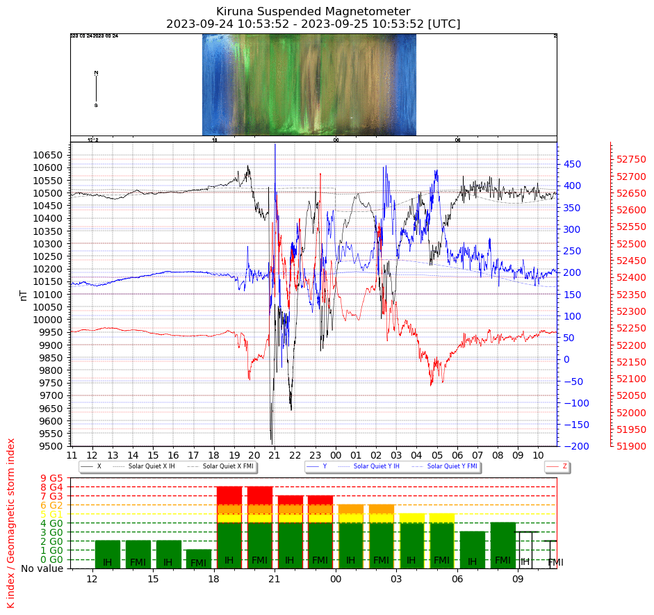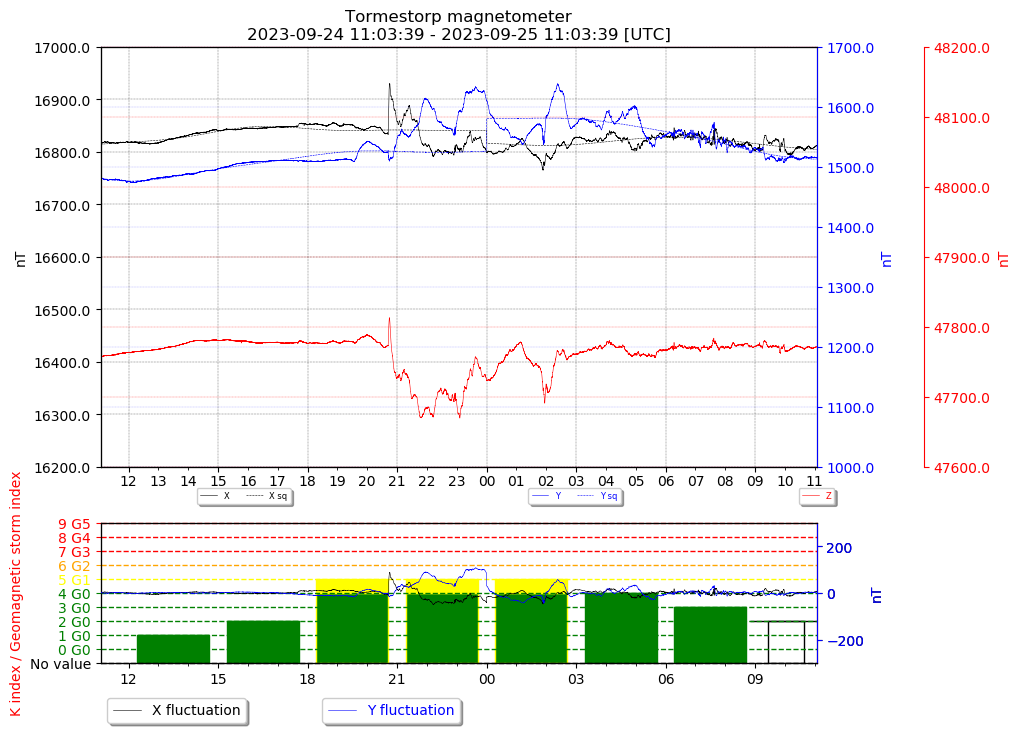 Kiruna (68deg.) and Tormestorp (56deg.) magnetometers are another great and popular instruments in Europe, measuring magnetic field strenght and set in Swedish towns of Kiruna and Tormestorp at the Institute of Space Physics facilities. It may look a bit frustrating to understand the magnetometers' graphs, so to simplify - just look at the deflection rate. Strong deflections from its typical day run could indicate a good chance of visual or photographic aurorae. A typical Kiruna magnetometer's graph with a strong Aurora ongoing (recorded on the night of 2023-09-25). A special note on Tormestorp magnetometer - as the instrument is is located at 56deg. it is less sensitive to higher latitude aurorae, therefore higher deflection on Tormestrop plotter would likely indicate an Aurora moving further South. A good example of Tormestorp auroral graph on the night of 2023-09-25 where many auroral reports were coming from Ireland and the UK.