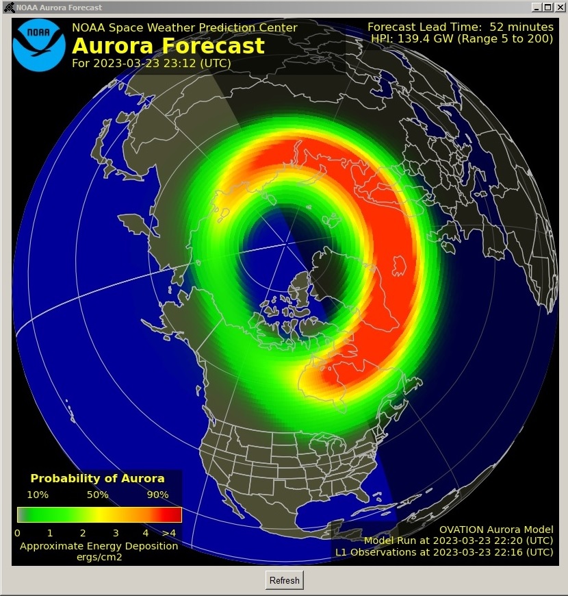 NOAA Aurora Forecast channel is a perfect visualization of probability of an aurora and its intensity. Usually, the calculated Aurora Oval is having mostly greenish colours, but occasionally, its middle part turns yellow or red. That change in colour is quite important for higher mid-latitudes and indicates good chances of seeing a visual aurorae (even if the Oval is not quite reaching your latitude).