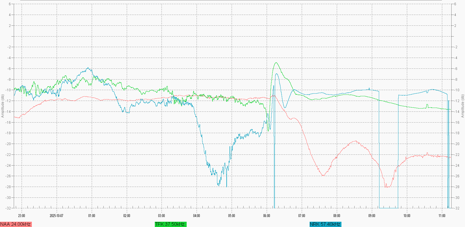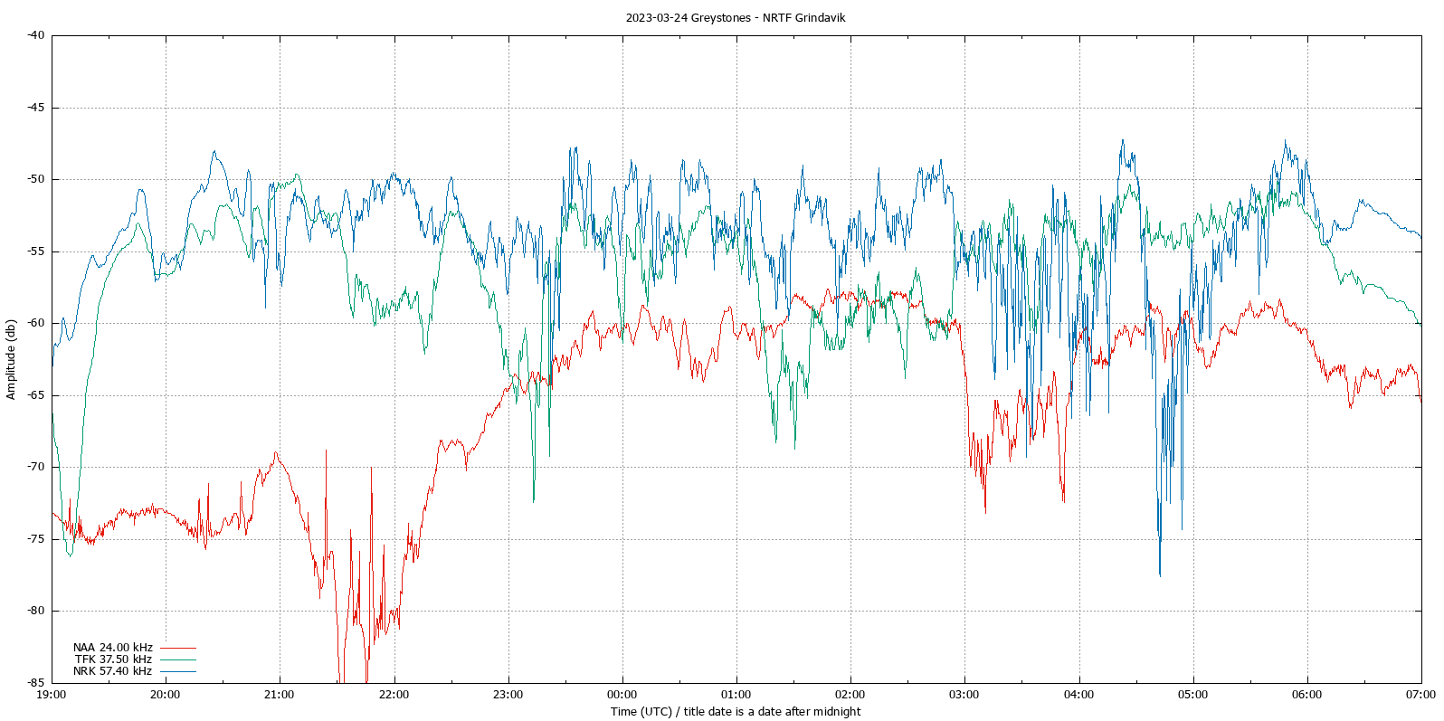 Ionospheric VLF plotter is our very own, experimental feature. We have a detailed guide of how to read the graphs in the User Articles section. The plotter is based on continuous measurement of the lower ionosphere's state. During potential aurorae both green and blue plotter graphs starts to deflect heavily within a short period of time, usually minutes. For a chance of higher mid-latitude Aurora, a graph deflection rate should be in the range of 10 - 30db (higher is better). Similar accompanying red graph deflection means very good chance of a visual Aurora. During very strong auroral events the graphs could behave differently (see one of the exception reports). You can browse through our Plotter Archive section, where we keep nightly recordings of the auroral plotter and make your own judgement. One good example recording is of 2023-03-24 where multiple reports of photographic and visual Aurora were coming from all over Ireland (NOAA HPI value that night jumped up to 139.4 GW). An exception example would be one of the strongest Auroras recorded in Ireland on 2024-05-10 where an HPI value raised to rarely seen 361.9 GW
